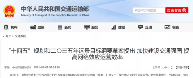 3月5日,《國民經濟和社會發展第十四個五年規劃和2035年遠景目標綱要(草案)》提交十三屆全國人大四次會議審查。綱要草案提出,到2035年,我國將基本實現社會主義現代化,基本實現新型工業化、信息化、城鎮化、農業現代化,建成現代化經濟體系。綱要草案中,交通運輸是“高頻詞匯”,在建設現代化基礎設施體系、打造數字經濟、促進區域協調發展等多個方面均作出明確要求,第十一章第二節專門提出加快建設交通強國。