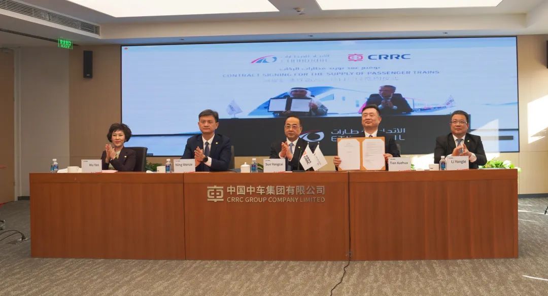 簽約儀式在北京和阿布扎比兩地以視頻連線的方式舉行。中國駐阿聯酋大使館公使周飆、中國中車董事長孫永才共同見證了簽約儀式。中車四方股份公司董事長田學華、阿提哈德鐵路公司CEO沙迪·馬拉克代表雙方在合同上簽字。