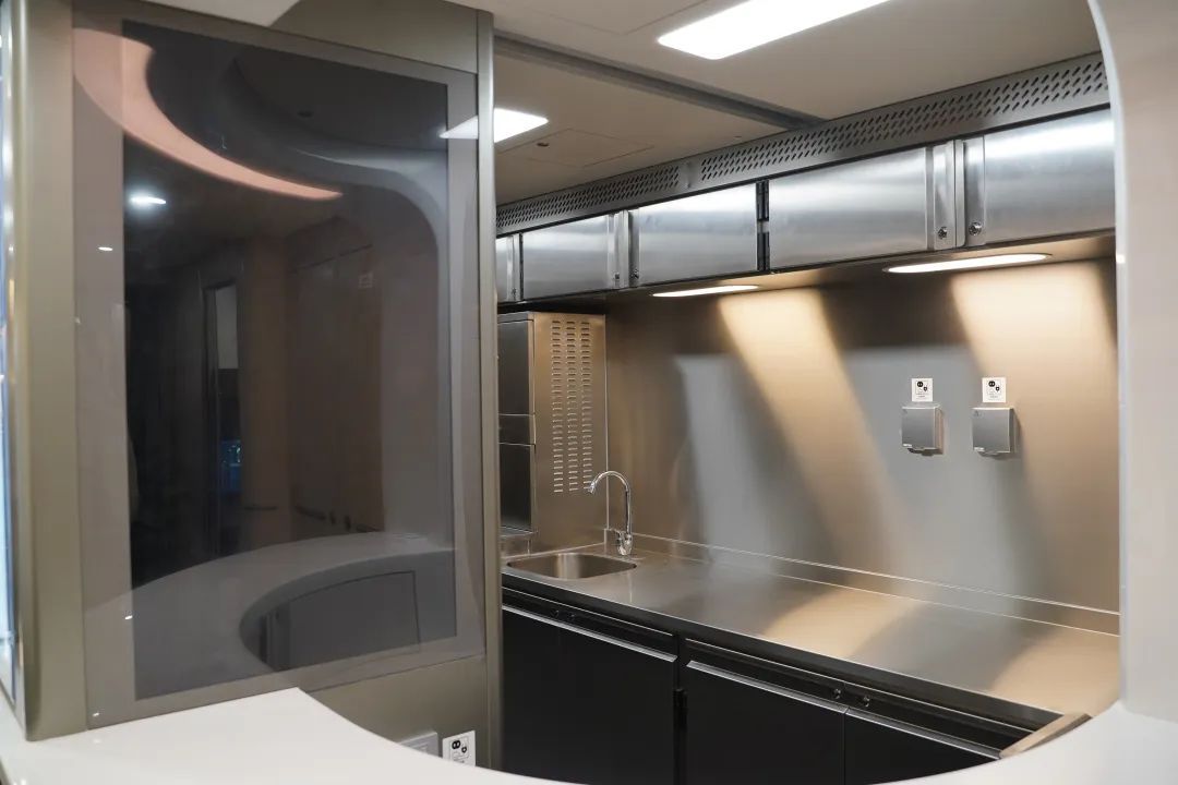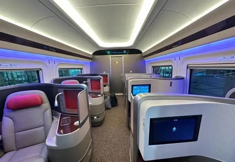 服務設施舒適便捷。車廂座椅均基于人因工程學進行優化,讓旅客乘坐更加舒適、體驗更美好。二等座椅靠背上增加方便旅客使用的USB充電接口,加深小桌板杯托凹槽深度,提高水杯放置的穩定性。一等座椅增加電動腿靠、可調節頭靠,座椅間設置雙USB口插座,方便旅客取用。商務倉采用“魚骨式”布局設計,一人一艙,保證乘坐私密性,座椅增加無線充電、手機投屏、在線觀影等功能,滿足商務旅客需求。4號車廂為無障礙車廂,配備更寬的通過門、無障礙衛生間、輪椅及大件行李放置區等,所有服務設施均增加盲文標識,更好地滿足特殊旅客的出行需求。