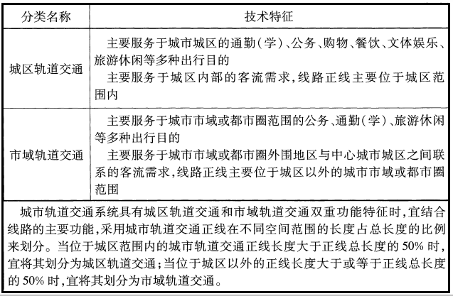 城市軌道交通按照空間范圍劃分為城區軌道交通和市域軌道交通兩類。各分類的技術特征見下表: