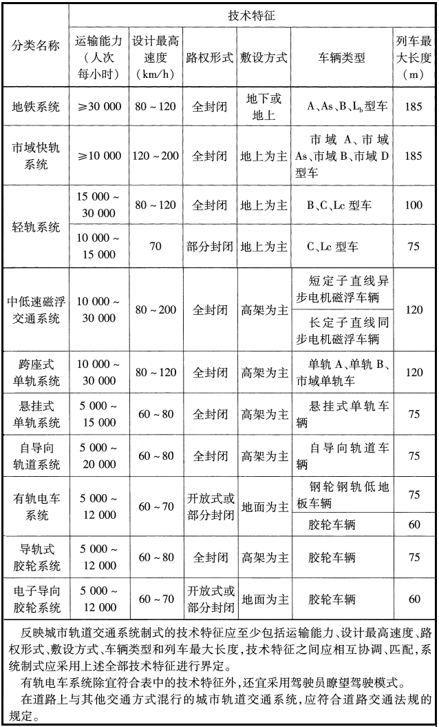 城市軌道交通按照系統制式劃分為地鐵系統、市域快軌系統、輕軌系統、中低速磁浮交通系統、跨座式單軌系統、懸掛式單軌系統、自導向軌道系統、有軌電車系統、導軌式膠輪系統、電子導向膠輪系統十類,各分類的技術特征見下表: