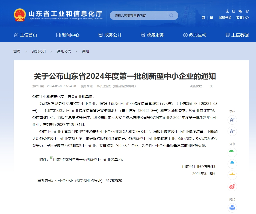 2024年5月8日,山東省工信廳發布文件通知,朗進科技被列入“山東省2024年度第一批創新型中小企業”。